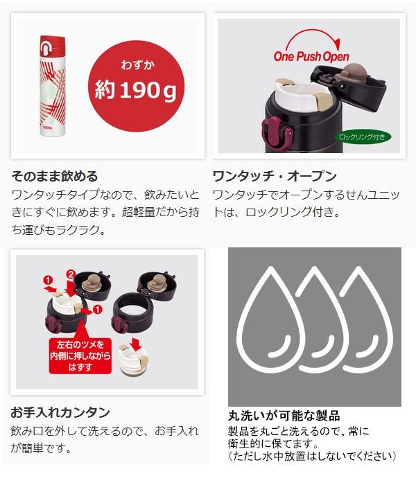 | 素材・材質 | 本体ステンレス鋼(アクリル樹脂塗装) フタ:ポリプロピレン 飲み口・栓本体:ポリプロピレン フタパッキン:シリコーン 栓パッキン:シリコーン |