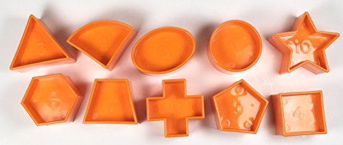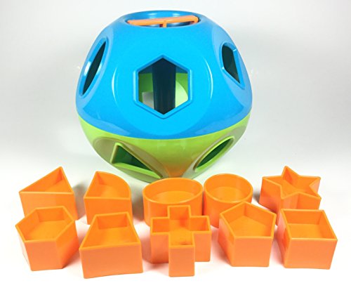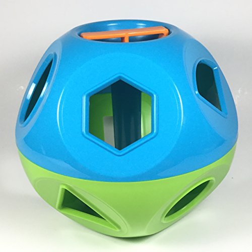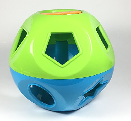 Great for Ages 6 Months and up 10 different Shapes Handle Easy to Grasp and Pull Apart Lime Green and Cool Aqua Ball with 10 Orange Peel colored shapes