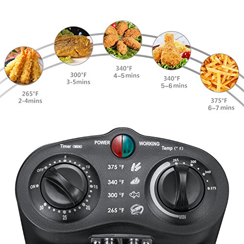 Adjustable temperature and timer control - A temp dial and a timer dial on the fryer provides versatility for cooking different types of food. You can get the temp of the oil just right for your food to be tasty, rather than greasy or burnt. Perfect for making delicious french fries, chicken, onion rings, shrimp and more.
