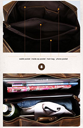 -. Feature : 16.15''l x8.67''w x9.06''h; Genuine leather duffel bag for 2-3 nights business trip / Interior Include laptop compartment (Fit for laptop 14" or less), 1 zippered pocket, 3 open pockets for pens, cellphone and cards / With detachable and adjustable shoulder straps for comfortable wearing, no compression feeling at all.Plastic feet for protection; Brass hardware;Quality zipper of fluent and smooth. / Lage tag:Fill in the name tag or insert your business card. Perfect gift for frequent travelers / 100% full grain top layer crazy horse leather with cotton as interior lining,high quality and durable