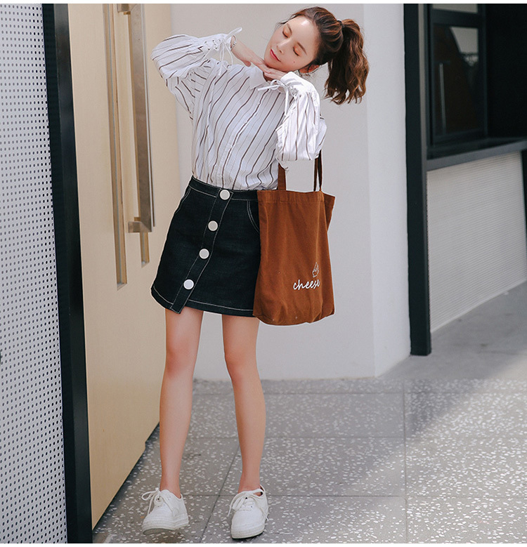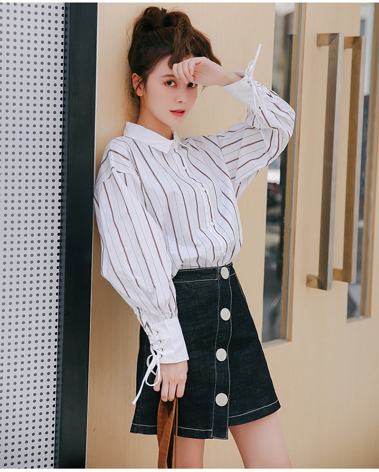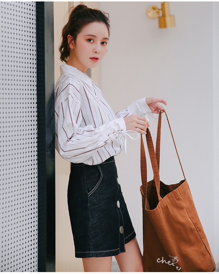 袖元の編み上げは女性らしく可愛らしい雰囲気を演出し、細めのストライプはすらっとした印象に仕上げてくれます。