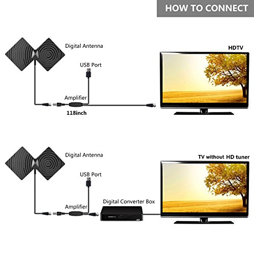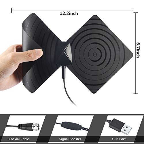 ?Specification: Antenna Size: 12.2×6.7×0.59 in Range: 50 miles with amplifier Frequency: VHF /UHF 170-230MHz / 470-862MHz Connector: F male / IEC male or customized Power supply connector: USB Gain: 25DB (with amplifier) / 5DB (without amplifier) Impedance: 75 Ω Polarization: Vertical / Linear
