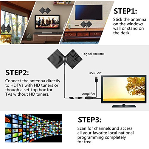 ?Installation Instruction: (1). Place the leaf in a desired location. (2) The antenna plug into the power supply, confirm the power indicator light is bright, ensure the antenna power supply is normal. (3) Assembled antenna, the wire connection between tuner and set-top box. Turn on the TV and set-top boxes switch, according to the instructions on the remote control, turn on the TV menu page. (4) confirm the signal quality and signal strength and then slowly rotate the angle of the antenna. The rotating antenna signal intensity reached the highest. (5) Confirm your television menu can search all the TV programs. (6) When the TV programs are very clear, you can put the leaf fixed. Then just enjoy your HD TV programs for free.