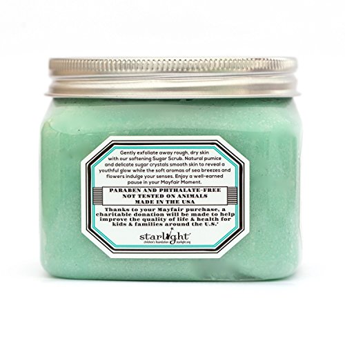 Reveal brilliantly glowing, revitalized, and restored skin with this gentle body sugar scrub. Natural pumice and sugar crystals work together to delicately exfoliate rough, dry skin. This sweet floral aroma delights senses with a fusion of White Lily, Jasmine, Rose, and a touch of soft, sweet berries for an unforgettably sumptuous fragrance. For each Mayfair product purchased, a donation is made to Starlight Children's Foundation to help improve the quality of life for kids and families around the US experiencing difficult health challenges.