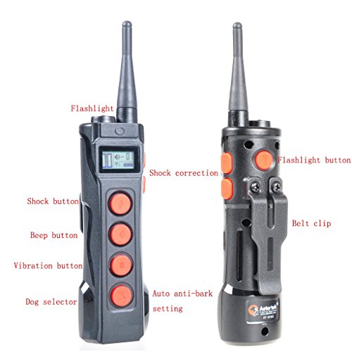 Studio : Aetertek Publisher : Aetertek Binding : Misc. Product Description Description: Aetertek specializes in manufacturing dog training collars, dog fences and other pet training related products.Having been in the pet training industry for over 10 years 919C system is the top of line dog training collar system offered by Aetertek. Its' professional build quality, long range, rechargeable and waterproof technology, that makes your receiver submersible . This shock collar has 4 functions: shock, vibration , beep and auto anti bark. With all these features, it makes it perfect for someone needing long range for a big yard, sporting dog or stubborn dog. Features: 1. Features multi-functional modes(Shock, Vibration, Warning Beep Tone and Auto anti-bark). 2. Collar Size: Able to fit small, medium and large dogs. 15 lbs or Larger. TPU Collar Size from 14 to 24 inches long 3. Remote Transmitter can control up to two collars. 4. Electric remote Range: Up to 1093 Yards 5. Battery Type: Rechargeable Lithium Batteries for Collar Receiver and Remote Transmitter 6. Water Capabilities: Waterproof Collar Receiver and water-resistant transmitter 7. Stimulation Levels: 10 Levels of Static Shock 8. LCD display to show the correction levels and dog mode/channel. 9.Conserves power when not in use to extend battery life 10.It comes with the auto anti bark feature which can stop your dog's bark when you are out of home. 11.The remote comes with a flashlight . 12.Red Rubber button,your finger will feel more friendly and comfortable