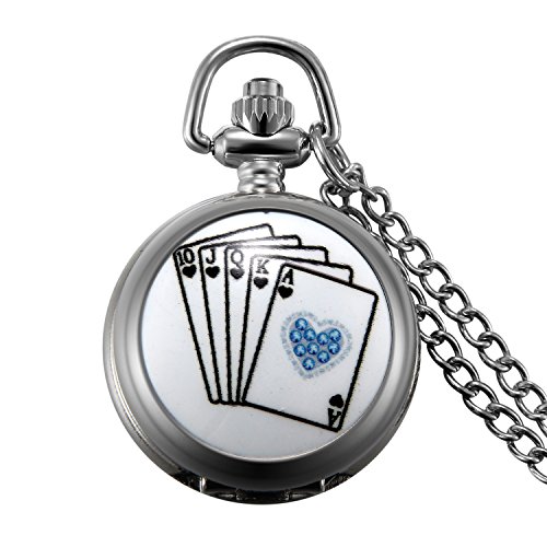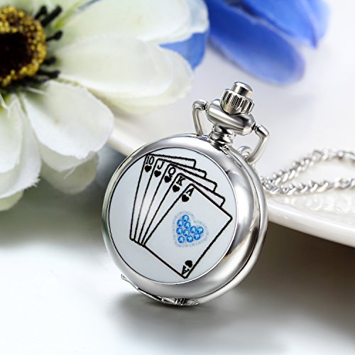 -. Binding : Watch -. Brand : Jewelrywe -. Department : Unisex-adult -. EAN : 6954847775925 -. Feature : Full Hunter Small Pocket Watch with Flush Poker Cards Design / The pocket watch comes with a long chain when you get it. / Good present for families or friends / This watch is really working and keeps time, is battery operated. / Including one blue velvet bag P.R.Inted "JewelryWe" on it. -. Label : JewelryWe -. Manufacturer : JewelryWe -. Model : JW68P0057 -. MPN : JW68P0057 -. PackageQuantity : 1 -. PartNumber : JW68P0057 -. ProductGroup : Watch -. ProductTypeName : WATCH -. Publisher : JewelryWe -. Studio : JewelryWe -. Title : JewelryWe Classic Silver Polished Royal Flush Poker Cards Mini Pocket Watch with 32" Chain for Women Men