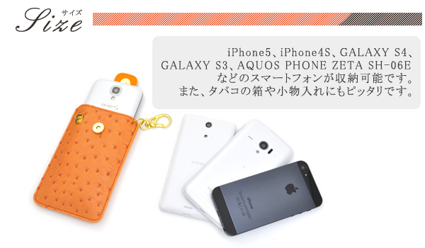 | ■オーストリッチのデザインが高級感漂う、汎用オーストリッチデザインポーチです。 iPhone5、iPhone4S、GALAXY S4、GALAXY S3、AQUOS PHONE ZETA SH-06Eなどのスマートフォンが収納可能です。また、タバコの箱や小物入れにもピッタリです。 ■留め具で固定すればバッグに付けて持ち運ぶことができます。 また、付属のストラップで肩からかけてお使いいただくことも可能です。 ■内部は柔らかい生地を使用しているので中にいれたスマートフォンや小物を傷つけません。 ■カラーはオレンジ、ホワイト、ピンクの3色からお選びいただけます。 ※ライセンス商品ではありません。 ※スマートフォンは付属しません。 |