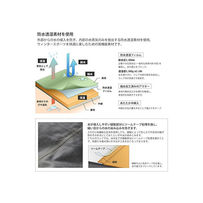 내수압5000mm,투습3000g,발수 가공필로 안심 기능성.한층 더 중면-안솜 들어감으로 따뜻하다.