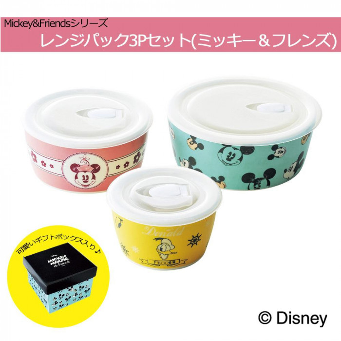 ミッキーとミニー、ドナルドダックが描かれたレンジパック3点セットです。ボウルにも保存容器にもなり、サイズもS・M・Lと3種類がセットに♪楽しい食卓を演出します。 |