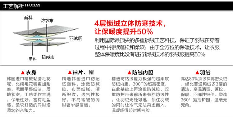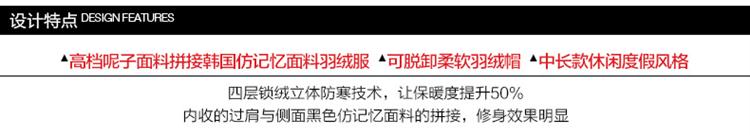 可脱卸羽绒帽、修身线条裁剪拼接、韩国进口高档仿记忆面料