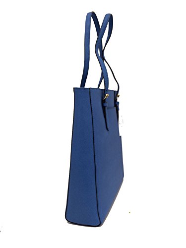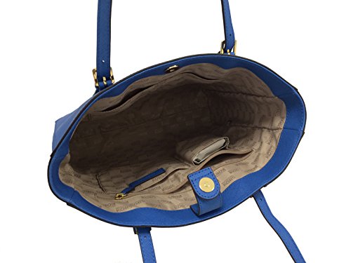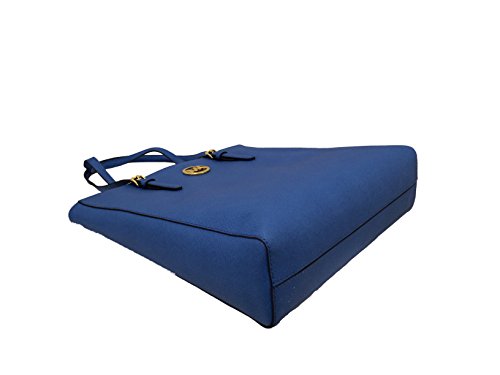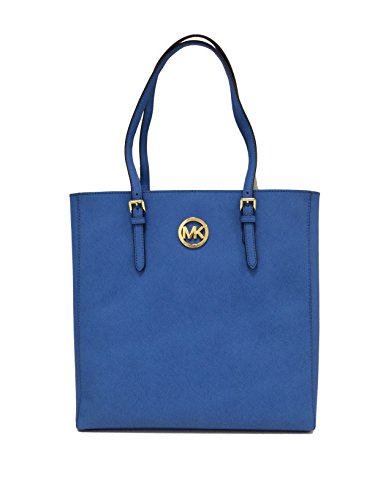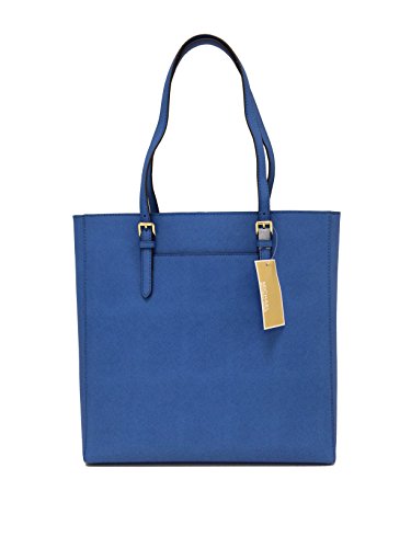 Add a pop of color to your wardrobe with Michael Kors large North South Tote wrapped in Heritage Blue saffiano finished leather with polished golden tone hardware. The spacious interior features a zippered pocket and 4 open slip pockets. The fully open top has a magnetic snap closure and the back features a small open slip pocket. The dual straps have a very comfortable drop of about 9 inches. It measures about 15.5 inches (L) x 14 inches (H) x 3.5 inches (W).