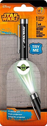 -. Feature : Yoda Star Wars projector pen. / Push button activated bright Yoda Star Wars projection scene. / This black Ink pen projector pen makes a great gift or party favor for any Star Wars Fan. / 1.0 mm pen twist tip pen, batteries included. / Yoda projector pen is great for any Star Wars enthusiast!