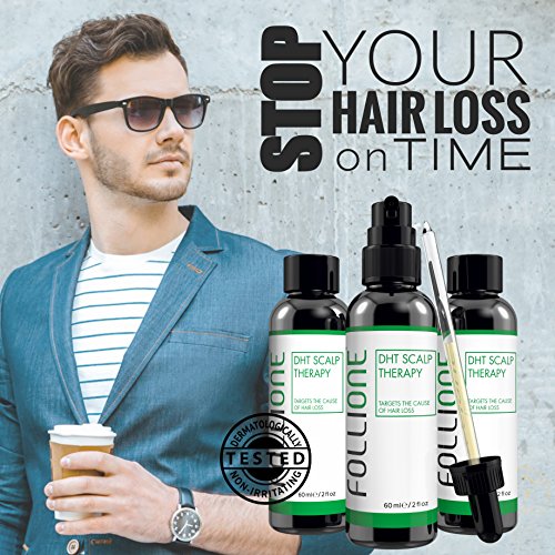 Follione DHT scalp therapy deals with hair loss and treats the root cause by various methods. In addition to its scalp anti-aging effect, the active ingredients fight hair loss using different mechanisms.