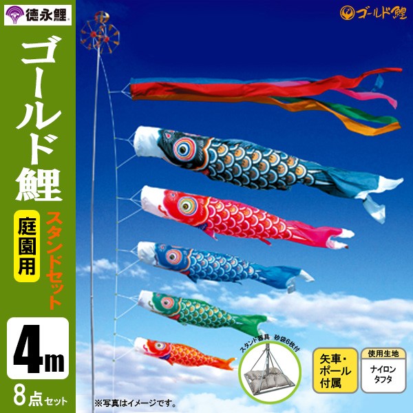 こいのぼり/鯉のぼり 庭園用スタンドセット(こちらの商品は家紋・名前入れはできません。ご了承ください。)鯉のぼり 室内用 鯉のぼり ポール 鯉のぼり マンション 鯉のぼり 庭 園用 鯉のぼり 手作り 久月鯉のぼり 鯉のぼり ポール 鯉のぼり 徳永 取扱(セット内容)・吹流し4m・黒鯉4m・赤鯉3m・青鯉2m・緑鯉1.5m・橙鯉1.2m・矢車一式・ロープ20m・ポール6.8m(7本継)・砂袋6枚入り・ハーケン3本・補助ロープゴールド鯉 鱗に金粉で黄金鶴柄を配して、生地には光沢のあるナイロン生地を使用した光輝く鯉のぼりです。吹流しには魔除けの意味をもつ五色を用いた五色吹流しをセットしています。軽くてよく泳ぎ、鮮明な色調、水に強い鯉のぼりです。