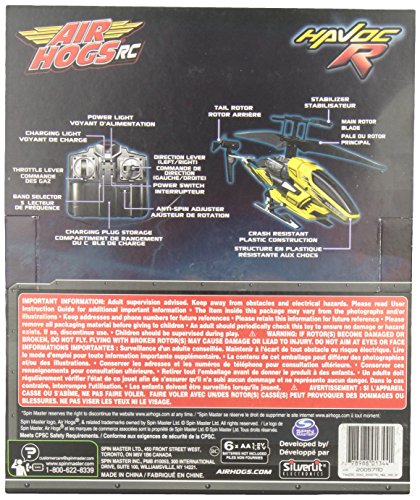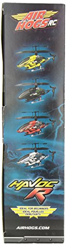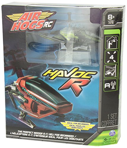 - Feature : Experience the thrill of indoor flight with the Air Hogs R/C Havoc Heli - North America's #1 selling R/C Helicopter!^Infrared Remote Control comes in multiple frequencies allowing up to 3 pilots to fly Havoc Helis in the same room^Accurately navigates tight corners and sharp curves with 4 directional control^The Havoc Heli is made of a high-composite body that is highly durable against crash landings. Made for ages 8+^Includes: 1 Air Hogs RC Havoc Heli, 1 Controller/Charger, Spare Tail Propellar, 1 Rotor removal Tool, 1 User Instruction Guide, Requires 6 AA batteries, not included.