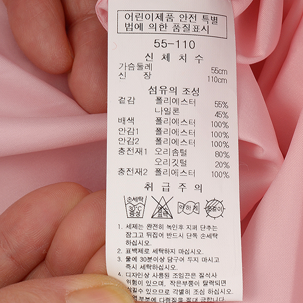 제품소재 : 겉감: 폴리에스터55% 나일론45%배색 안감1 안감2: 폴리에스터100%충전재1: 오리솜털80% 오리깃털20%충전재2: 폴리에스터100%