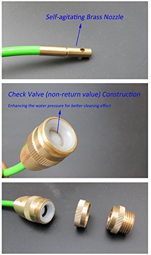 -. Feature : NO TOXIC AND NO CHEMICALS: Using high pressure water to clear the clogged pipe drains / HIGHT PRESSURE WATER: This item is with self-agitating brass nozzle and check valve (non-return value) construction which enhancing the water pressure for better cleaning effect / PRACTICAL: The item comes with 10ft. hose and 3-in-1 universal solid brass faucet adapter for easy use and 2 rubber ring which will make leaks a forgotten experience / BATHROOM NECESSITY: prepare it as a drain cleaner (or cleaning slow pipe drain before clogging) for easy life