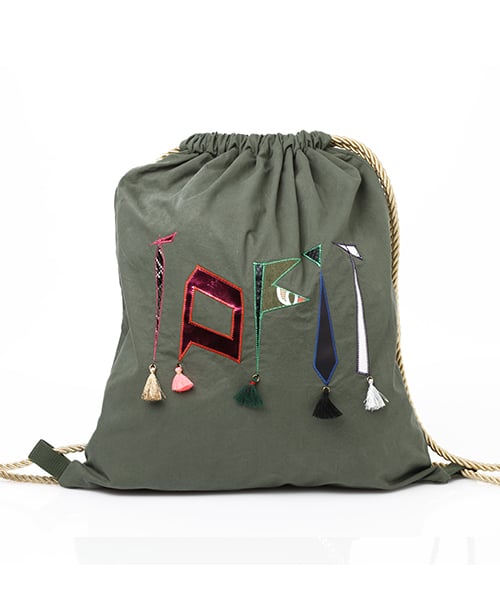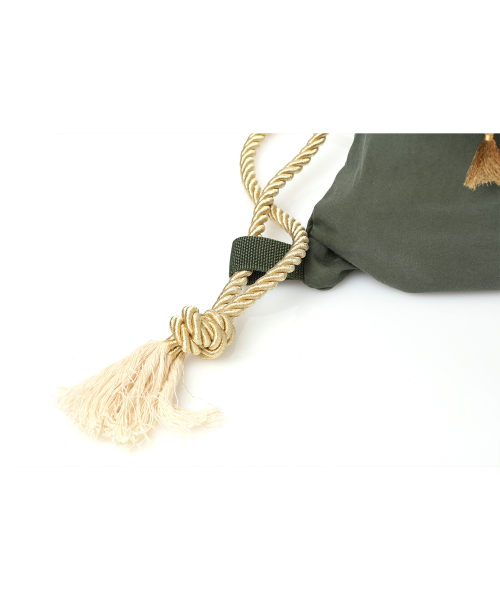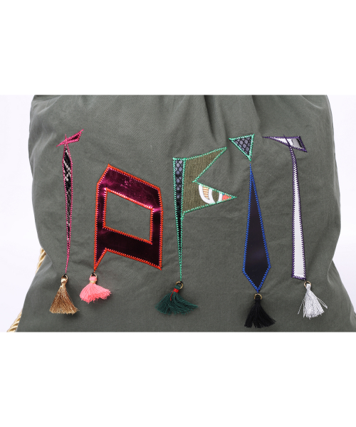 전면의 로고는 각기 다른 다섯가지의 원단을 사용하여 자수를 놓았고 수공예로 타슬을 달았습니다.