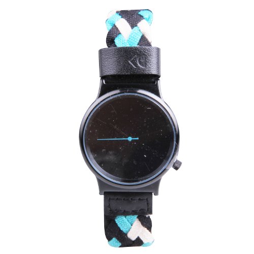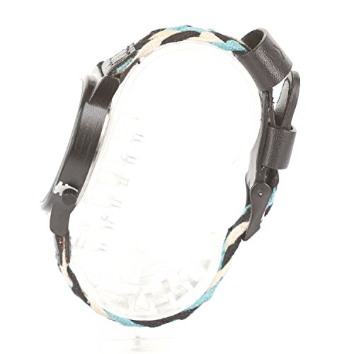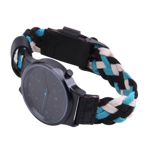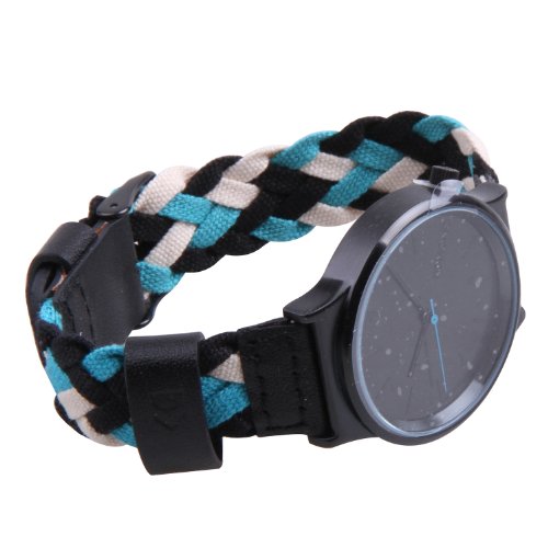 Product DescriptionMaterial woven band in blues and greens (like bleu cheese). Black round face with a black case. Leather accents. Stainless steel back.0