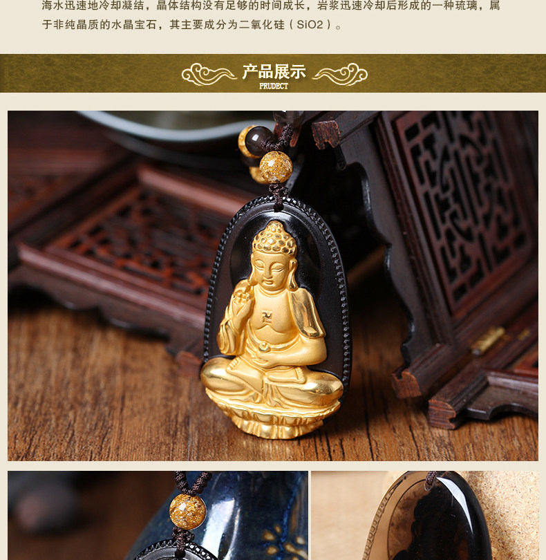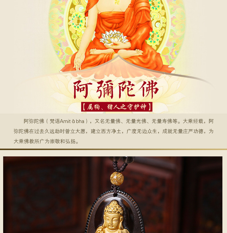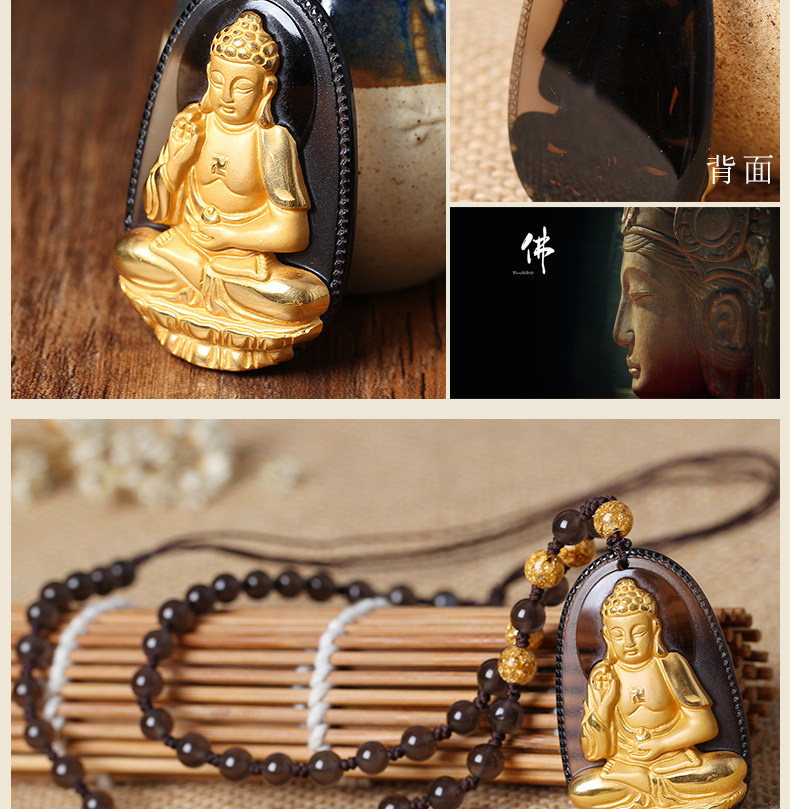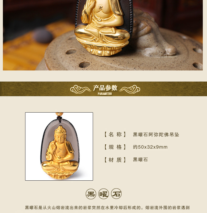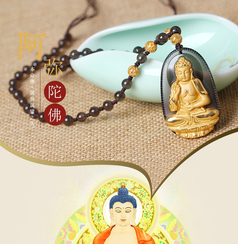 天然黄金冰种黑曜石阿弥陀佛十二生肖属狗猪本命佛守护神吊坠