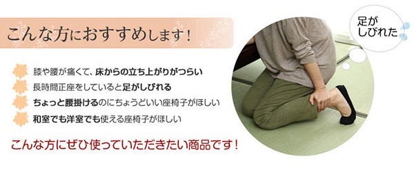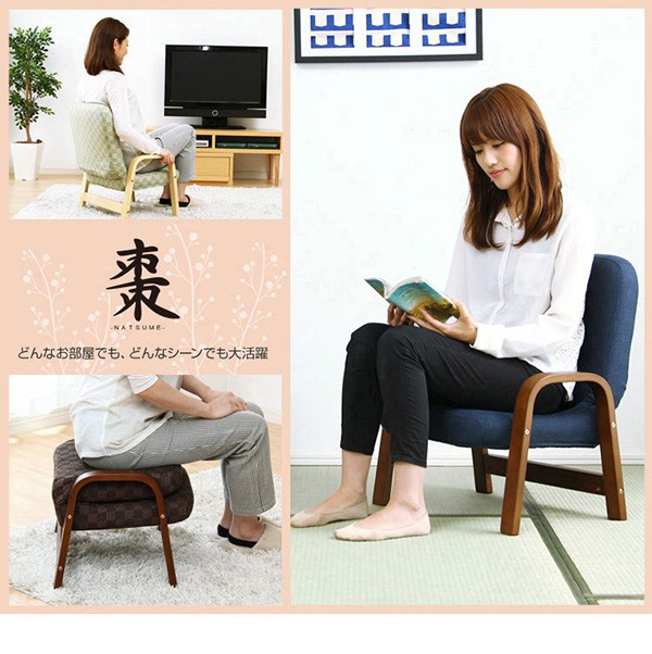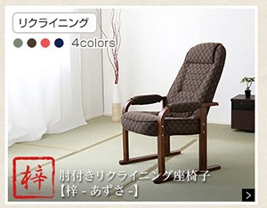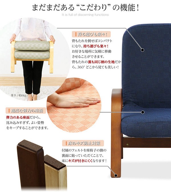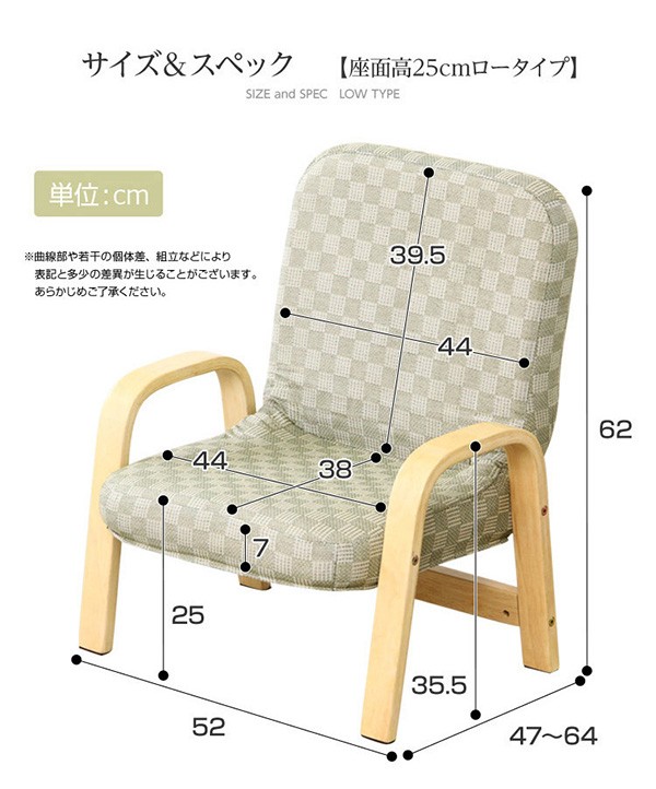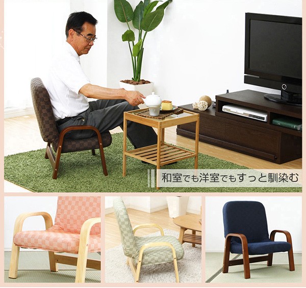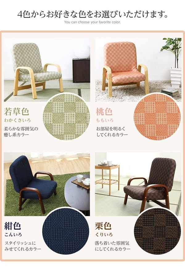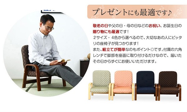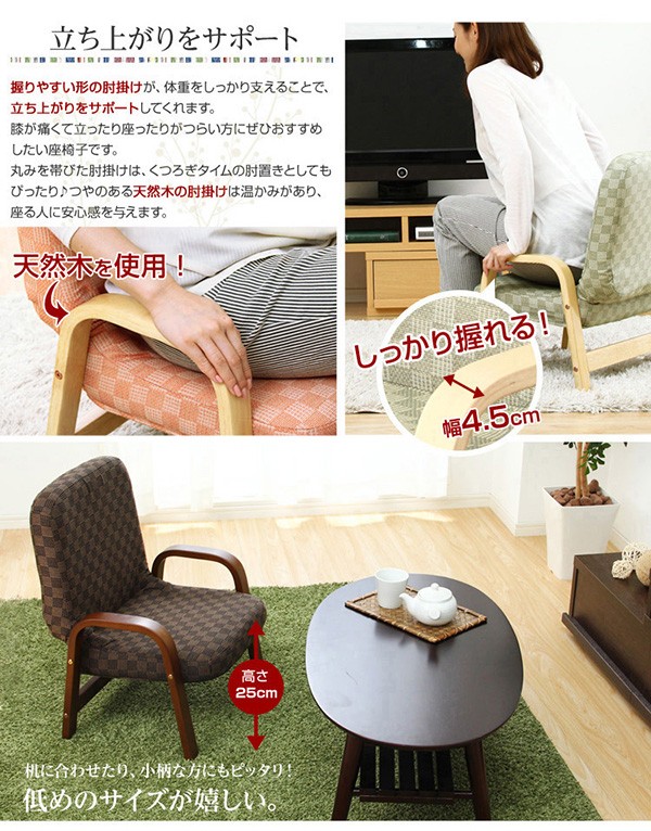 【商品について】腰掛けしやすい肘掛け付き高座椅子【棗-なつめ-】(ロータイプ・25cm高)■サイズ:外寸:(約)幅52x奥行き47~64x高さ72cm 座面高(約)25cm※商品重量:(約)6kg■カラー:桃色 若草色 栗色 紺色■素材:天然木(ラバーウッド)、ウレタン樹脂塗装、ポリエステル、ウレタンフォーム■その他:・お客様組み立て品です。 ・梱包サイズ:(約)48x43x22cm(1.6才)・梱包重量:(約)7kg ※メーカー直送品、商品代引き不可