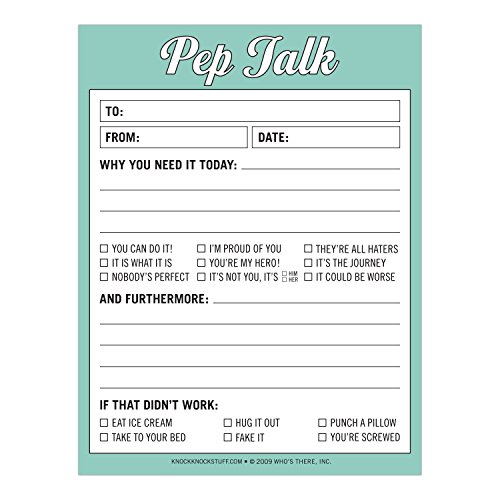 Studio : Knock Knock (Office Products) Publisher : Knock Knock (Office Products) Author : Knock Knock Binding : Office Product Product Description No one likes to be bummed out, but everybody drags from time to time-and that's why God invented pep talks. Turn those frowns upside down with this paper picker-upper-good cheer guaranteed! Encourage the easy way. Knock Knock is an award-winning purveyor of witty books and gifts. Our mission is to create products that bring humor, function, organization, and design to everyday life.? 0