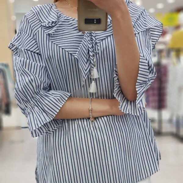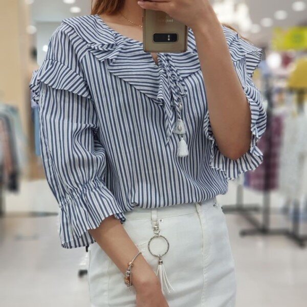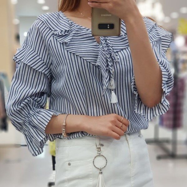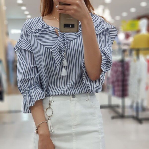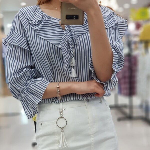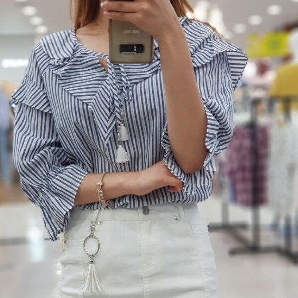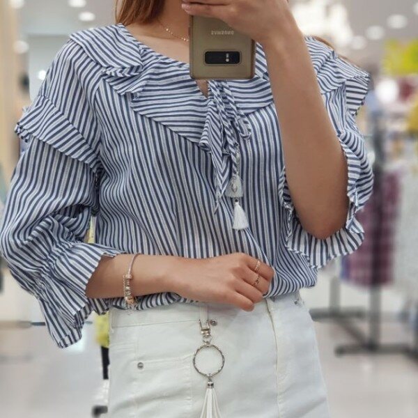 시원한 소재감으로 여름내 예쁘게 입고 싶은 블라우스입니다.시원한 패턴감과 귀여운 러플, 태슬 수슬리본으로 캐쥬얼하게 입기 좋은 상품입니다.