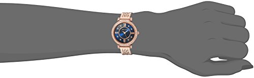Bezel set with 52 clear Swarovski crystals; mineral crystal lens; navy blue sunray dial with rose gold-tone hands and roman numerals; silver-tone glitter filled markers