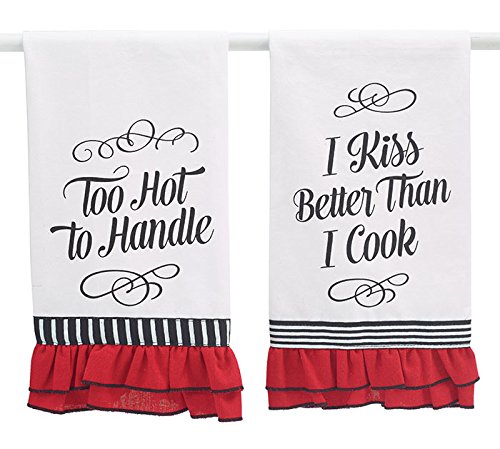 Studio : Burton Burton Publisher : Burton Burton Binding : Kitchen Product Description Tea towels with assorted messages. One comes with the message " too hot to handle". other comes with the message " I Kiss better than I cook". width: 13 inch Depth: 24.5 inch 0