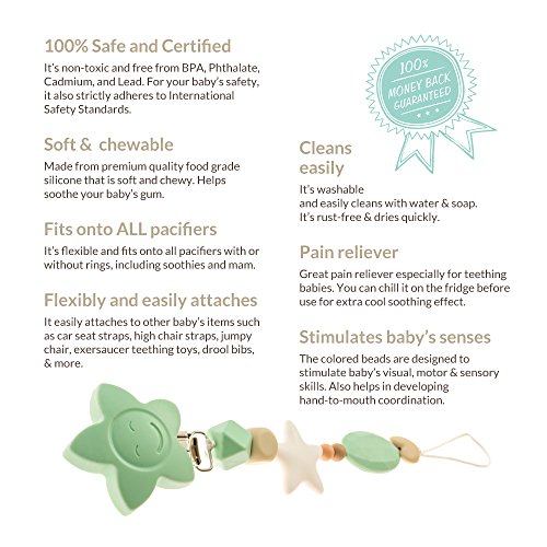 -. Feature : Made from food grade silicone, this baby pacifier clip + teether is designed to stimulate baby's senses-the colorful beads offers visual stimulation, and the differently shaped beads are designed to stimulate touch and feel, plus it offers an effective massage for painful teething gums and healthy tooth development. / It easily attaches to Soothie, Mam and other pacifiers, teething rings and toys, baby blankets, drool bibs, car seat straps, high chair straps, pacifiers. The clips open and close easily-no sharp clamps and no fear of baby's pinched fingers, and it comes off with a firm pull to prevent damage to baby's clothes. Clean easily with water and soap, or put in the dishwasher (top rack). / Easy to grab by small hands, helps with hand-to-mouth coordination, and lots of room to chew. Entirely made of food-grade silicone and plastic, so no worries about rust. Write baby's name on the back for easy identification. / Lil Teethers have been passed by the FDA, CPSC, California Prop 65, as well as Canadian, Australian and European authorities as a safe, food grade silicone teether/ pacifier clip for baby. It is non-toxic, BPA Free, no phthalates, cadmium, lead or metals. / Lil' Teethers Pacifier Clips are baby essentials and excellent baby gifts. Proudly sold with a Manufacturers - No Questions Asked - Money Back Guarantee. Scroll down for deals and check out the description below for more details.