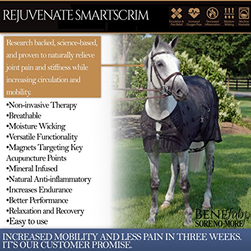 - ★ PATENT PENDING DESIGN – The Rejuvenate SmartScrim is a patent-pending, therapeutic equine blanket that provides incredible therapy to your horse. It is constructed with the highest quality ceramic-infused mesh, a textile based technology that utilizes the power of electromagnetism, a natural remedy for joint and muscle stiffness, edema, pain, and circulatory disorders. In addition, it also has 84 magnets placed over key acupuncture points for a further, more targeted therapy