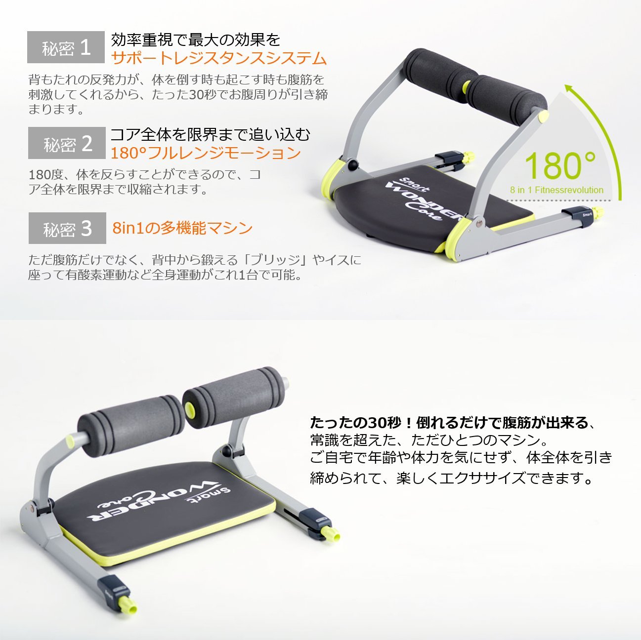 8種類の運動ができるから、腹筋だけでなく全身を徹底的に引き締めます。