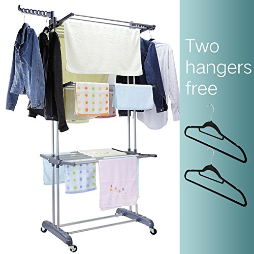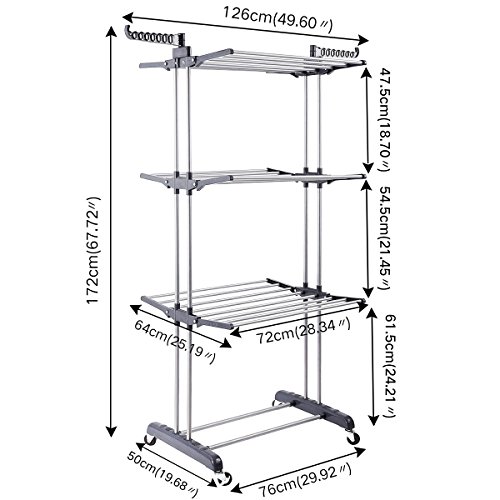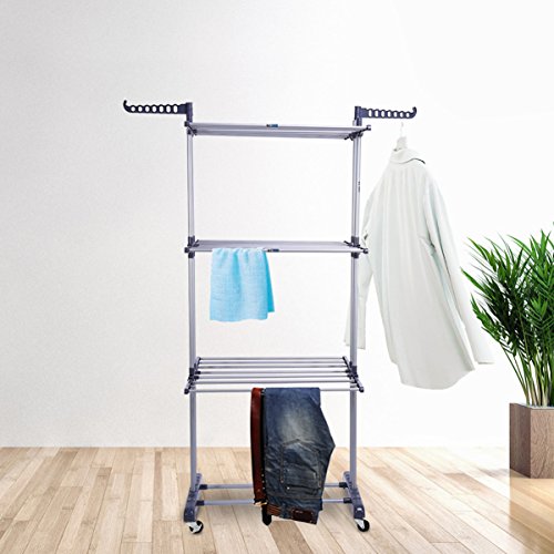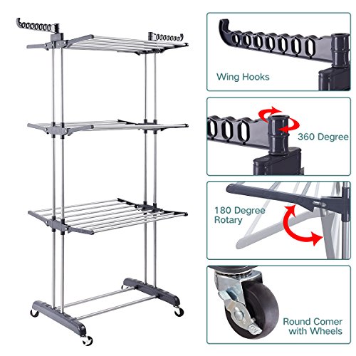 3 Tier Rolling Clothes Drying Rack Clothes Garment Rack Laundry Rack with Foldable Wings Shape Indoor/Outdoor Standing rack Stainless Steel Hanging Rods - Gray & Electroplate by Mogi's