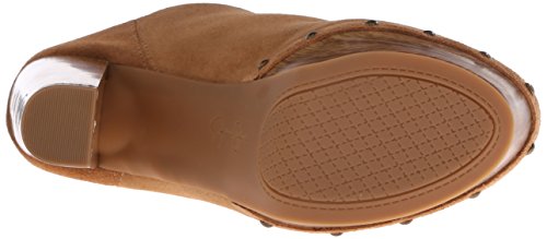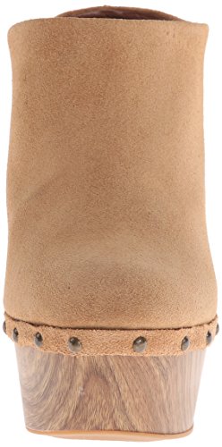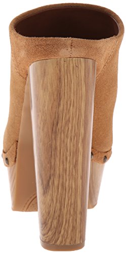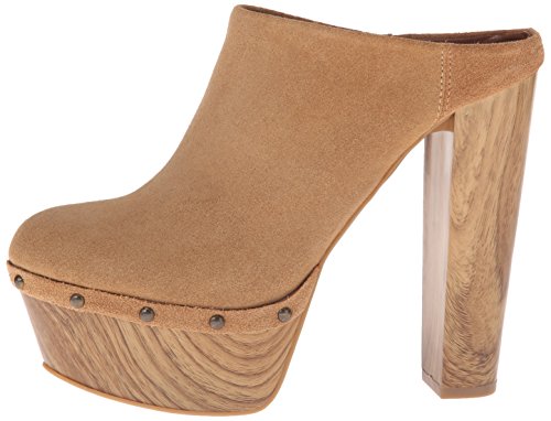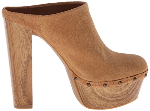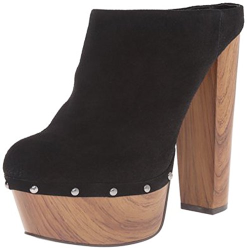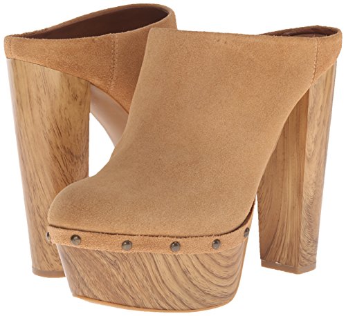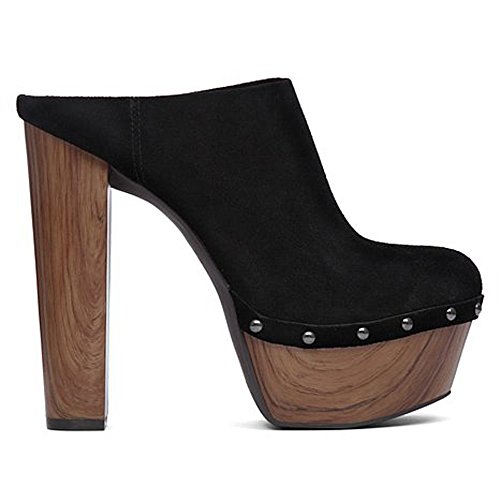 -. Feature : Elevated clog with wood-tone block heel and platform and metal rivets