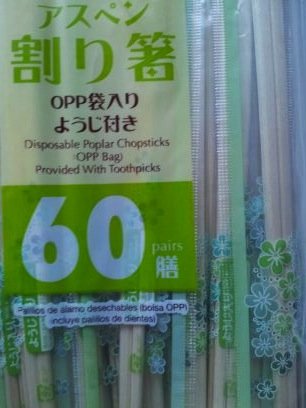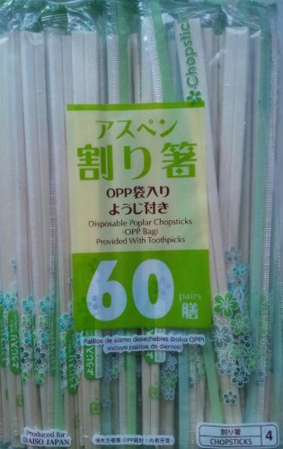 -. Brand : Daiso Japan -. Color : Wood color Beige -. EAN : 4549131039177 -. Feature : Disposable popular aspen chopsticks in Japan / Hygienic, each in OPP bag / Each provided with a toothpick / 60 sticks -. IsAutographed : 0 -. PackageQuantity : 60 -. ProductGroup : Kitchen -. ProductTypeName : KITCHEN -. Title : Disposable Poplar Chopsticks (Bag of 60 Pairs) (Clear Sleeve)