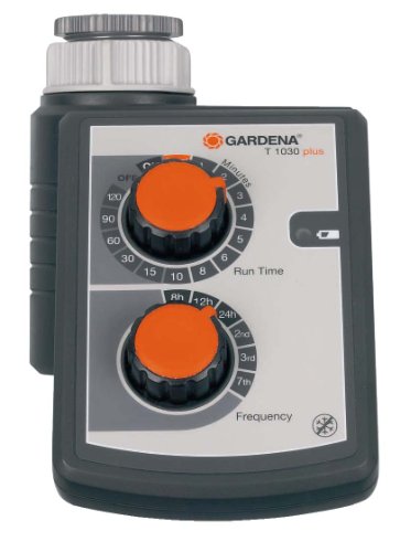 -. Binding : Lawn & Patio -. Brand : Gardena -. EAN : 4078500186087 -. Feature : Classic model with large, easy to use rotary knobs for simple programming. / Up to 3 watering cycles per day. / Watering times from 1 to 120 mins. / Connection for GARDENA Rain or Soil Moisture Sensor. / With battery level display. -. Label : Gardena -. Manufacturer : Gardena -. Model : 1860-U -. MPN : T 1030 plus 1860-28 -. PartNumber : T 1030 plus 1860-28 -. ProductGroup : Lawn & Patio -. ProductTypeName : OUTDOOR_LIVING -. Publisher : Gardena -. Studio : Gardena -. Title : Gardena 1860 Classic 3-Cycle Water Timer T 1030 Plus