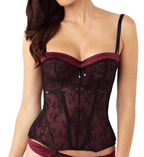 - Feature : 54% polyamide, 19% polyester, 15% cotton, 12% elastane c Country of origin: Imported Care: Hand wash Cold. Lay flat to dry. / 2-part uderwire cups are lightly padded, free of removable padding and support panels. / Cups are 3/16" thick. / Side seams with boning are 12" tall. / Center front is 13" long with satin bow and faceted "crystal" drops.