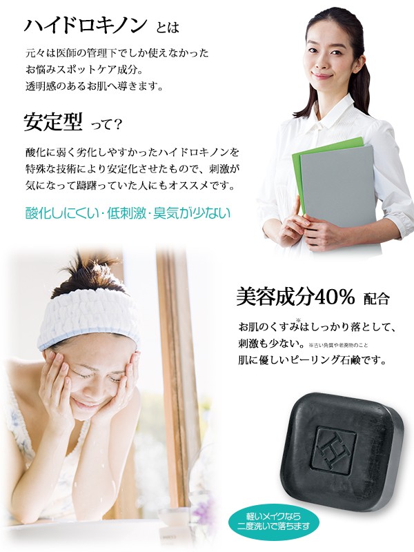 全成分:カリ含有石ケン素地、水、スクロース、グリセリン、エタノール、ソルビトール、DPG、デシルグルコシド、ラウラミドプロピルベタイン、HEDTA-3Na、ポリクオタニウム-64、ハイドロキノン、エーデルワイス花/葉エキス、カミツレ花エキス、ヒアルロン酸Na、セラミドNP、セラミドAP、セラミドEOP、フィトスフィンゴシン、ローズマリー葉エキス、セイヨウシロヤナギ樹皮エキス、ユズ果実エキス、アーチチョーク葉エキス、乳酸、グリコール酸、クエン酸、コレステロール、ラウロイルラクチレートNa、カルボマー、キサンタンガム、BG、フェノキシエタノール、安息香酸Na、ソルビン酸K、セタルコニウムクロリド、炭