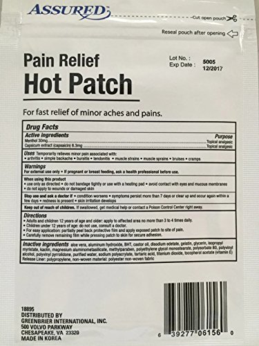 -. Title : Pain Relief Hot Patch - Assured - Fast Relief of Aches & Pains Due to Arthritis, Strains, Bruises, Sprains, Backaches - 2 Patches 3 1/8 in X 4 5/8 in - Resealable Package