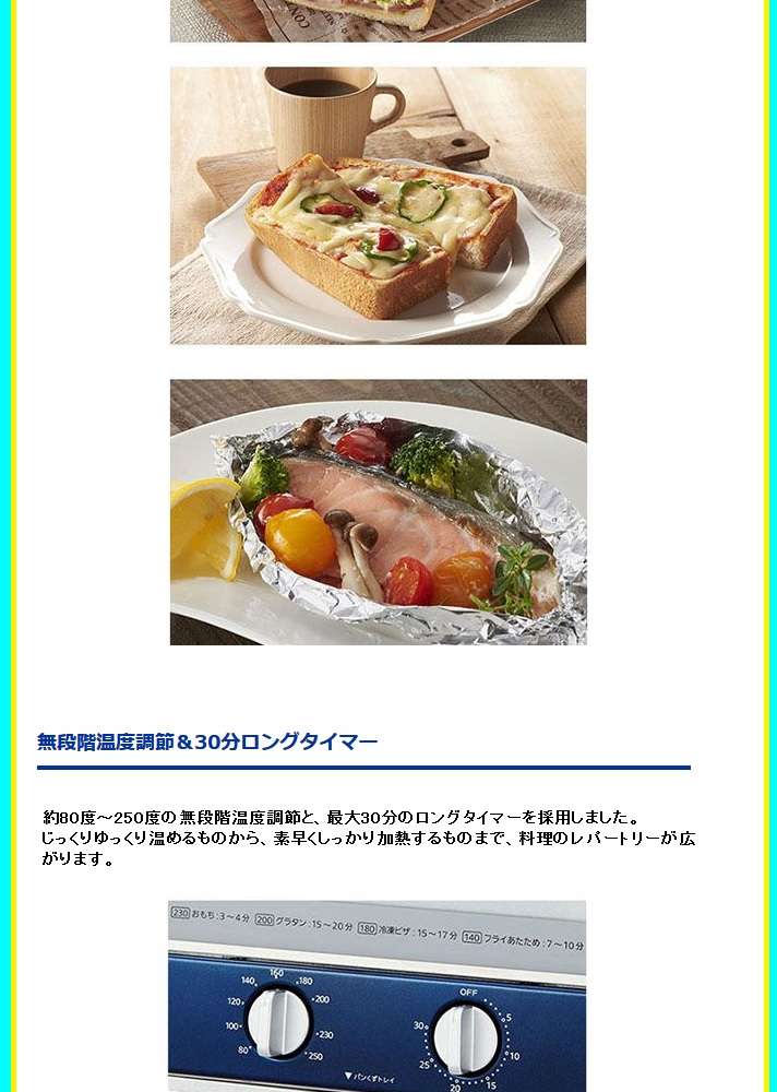 ●無段階温度調節&30分ロングタイマー。約80度~250度の無段階温度調節と、最大30分のロングタイマーを採用しました。じっくりゆっくり温めるものから、素早くしっかり加熱するものまで、料理のレパートリーが広がります