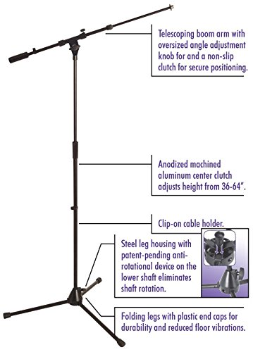 -. Feature : Boom Length: 19"-33" / Height Adjustment: 36"-64" / Base Spread: 24" / Color: Black Powder Coat / Materials: Thick steel tubing. Die-cast zinc clutch and leg housing