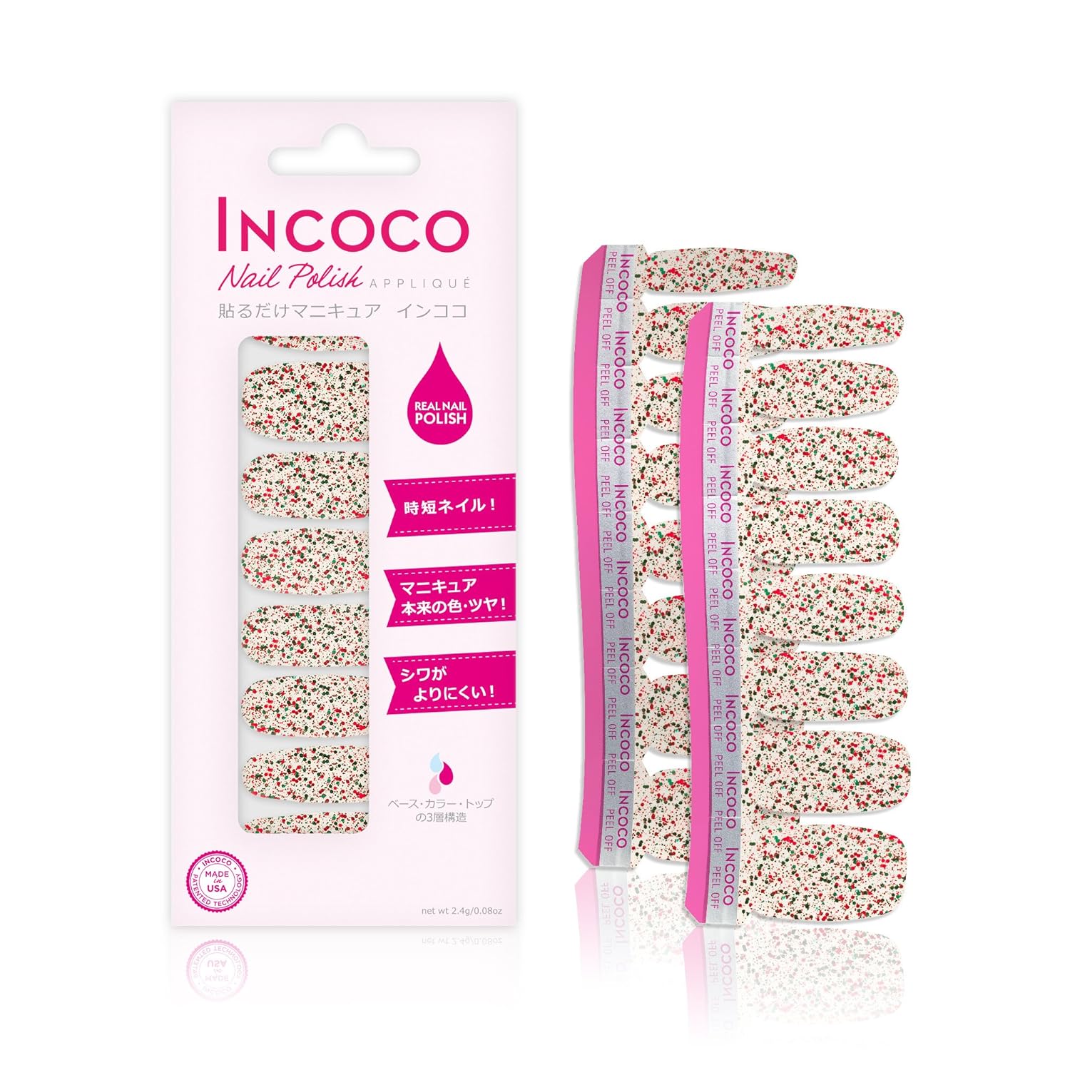 アメリカ生まれの貼るだけマニキュア 「インココ・ネイル・ポリッシュ・アップリケ」(Incoco)はマニキュア成分でできたシートタイプのマニキュアです。乾かす時間不要、塗りムラ知らず、且つマニキュアならではの発色やツヤを楽しめます。インココでまったく新しいマニキュア体験をしてみませんか!【数量限定】ホワイトカラーベースのクリスマスカラーグリッターネイル。みんなが大好きなシーズン到来!これをつけたらウキウキでハッピーになれちゃいますね^-^