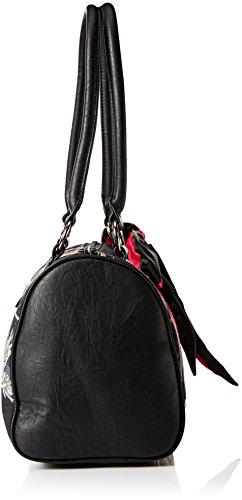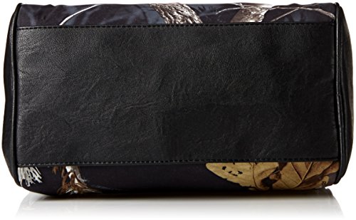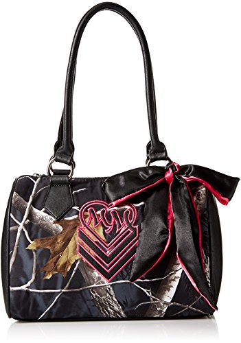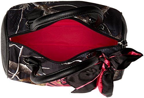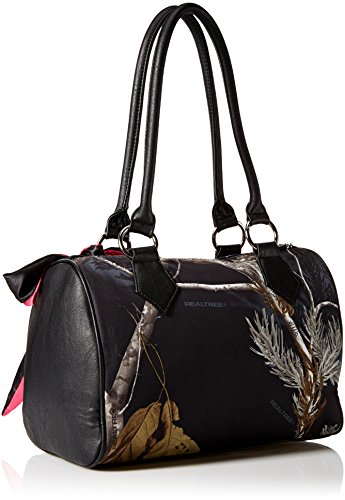 The shadowy purse is a barrel bag with real tree aphid front and back panels, contrast faux leather side panels, applique and trim, zipper top opening, two-toned bow and hot pink interior lining. 8.25 inch h x 11.5 inch w x 6 inch d strap drop: 9.5 inch