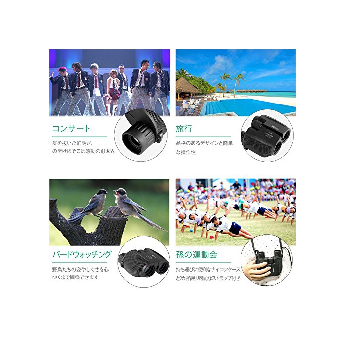【침침한 콘서트 홀에서도 밝은 화질을】:Nikatto쌍안경은 침침한 콘서트 홀에서도 밝게 클리어인 화질을 실현 생겼습니다.쌍안경을 통해 스테이지를 보면 시야가 어두워져 끝 스테이지가 잘 안보이다… 그렇지만,육안이면 스테이지가 먼 때문에,할 수 있으면 쌍안경에 스테이지를견 대… 이라고 하는 콘서트 씬의 딜레마를 Nikatto쌍안경은 해결합니다.Nikatto쌍안경은 폴로 프리즘식 광학 배율10배 BK7프리즘 경량240g이라고 하는 오름 스펙에 콘서트 씬 이외의도 사용 할 수 있는 콘서트 씬으로 특화 한 만능형 쌍안경입니다.