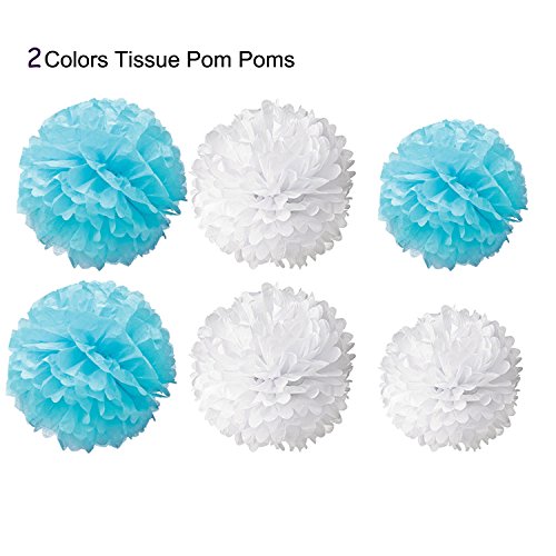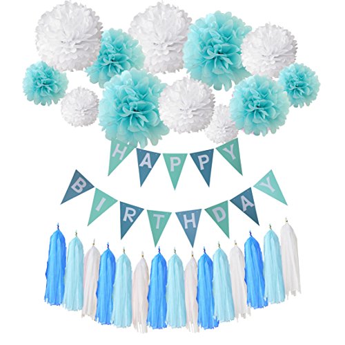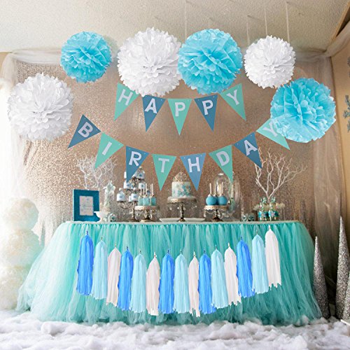 Packaged includes ---- 13 flags flag band ("HAPPY BIRTHDAY") 4 pieces 8’’ Pompoms paper flower (2 x blue and 2 x white), 4 pieces 10’’ Pompoms paper flower (2 x blue and 2 x white) and 4 pieces 12’’ Pompoms paper flowers (2 x blue and 2 x white), 15 pieces tassel (5 x blue and 5 x white, 5 x light blue)