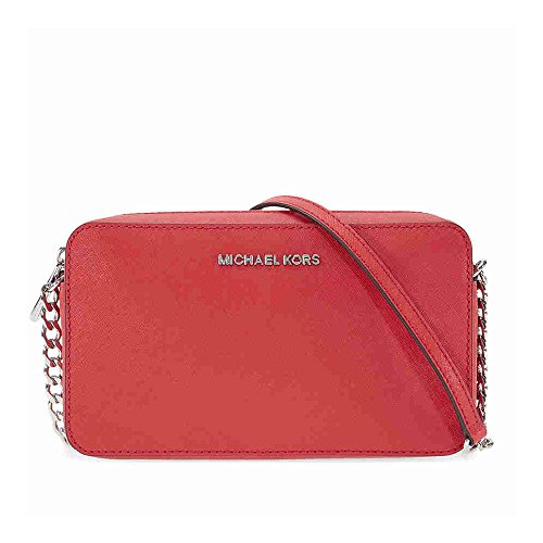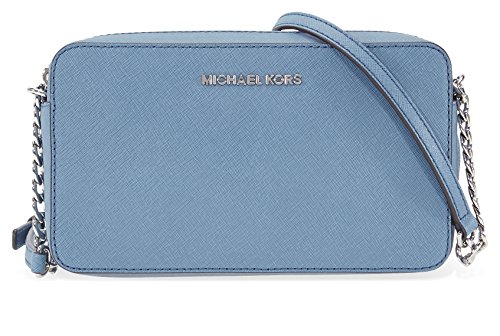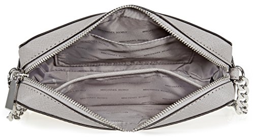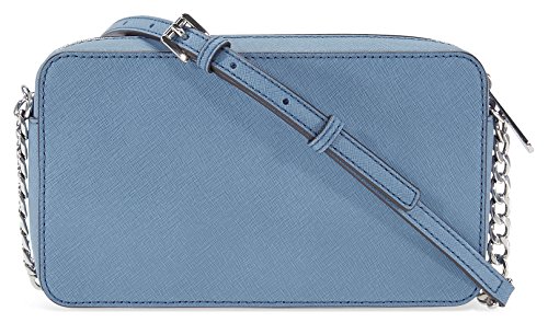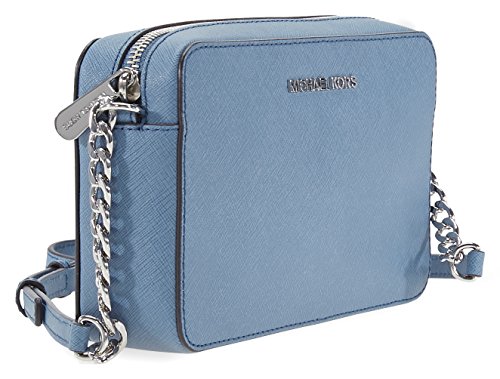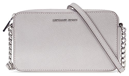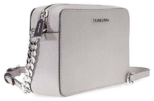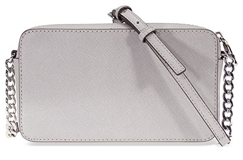 Product Description A Michael Kors Jet Set crossbody crafted in saffiano leather with silver-tone hardware and fully lined interior. This Michael Kors crossbody features a main zip pocket, two interior slip pockets and a chain leather shoulder strap with a 26" drop. Dimensions: 8.5" x 5.5" x 2". 0