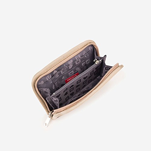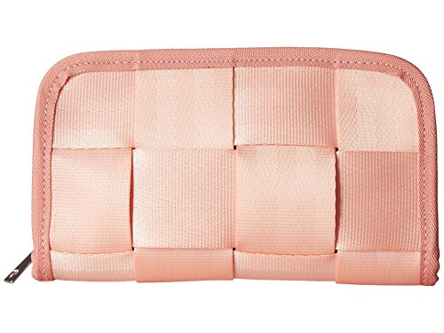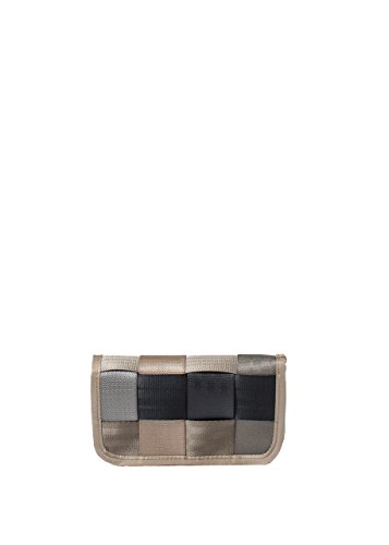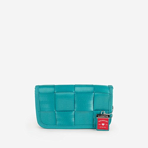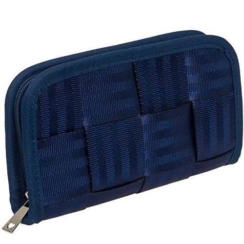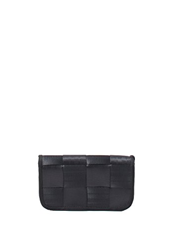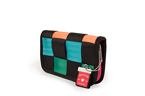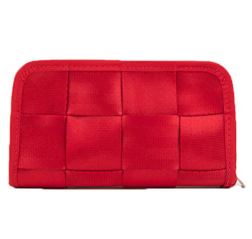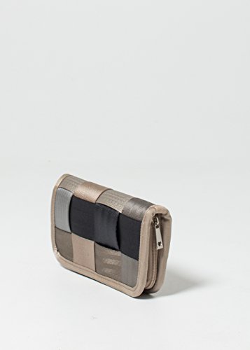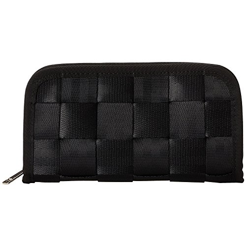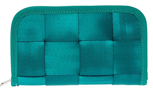 Hand woven in seatbelt. Fully lined with inner zip change pocket + extra credit card slip pockets with exterior zip closure.