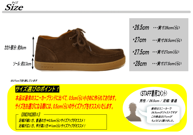 | サイズ | 作り⇒少し小さめ 【サイズ選びのポイント!】 足幅が細い方、普通の方⇒0.5cmくらいサイズアップがオススメ! 足幅が広い方、甲が高い方⇒1.0cmくらいサイズアップがオススメ! |