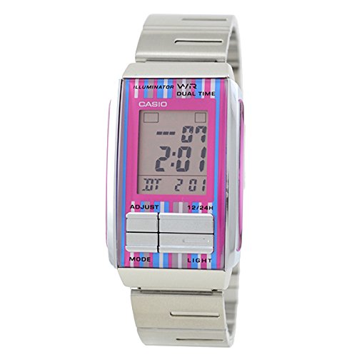 카시오의「LA-201W-4C」 스테인레스 소재에 통일 된 직사각형형 케이스와 벨트.문자판에는 액정을 채용 하고 있습니다. 기능으로서,날짜 요일 표시 기능,스톱워치 등을 탑재.또한중 유치 구조는 슬라이드식입니다.