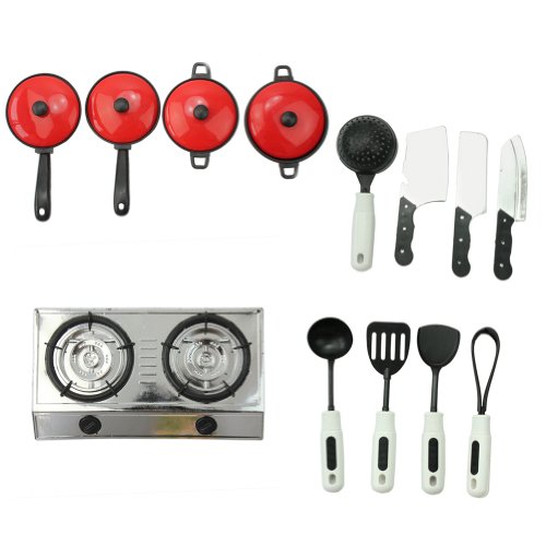 -. Feature : This set of mini kitchenware has 13 items, made of light and safe material. / Developing child's mind, creativity and thinking ability. / Suitable age: about 3 - 7 years old child / Material: Plastic / Color: Black + Silver + Red + White